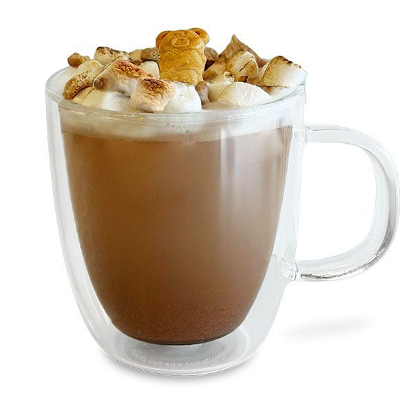 Steamed milk and espresso with toasted marshmallow syrup, real-cocoa chocolate sauce, topped with torched marshmallows, and garnished with a dusting of graham crackers and a teddy graham