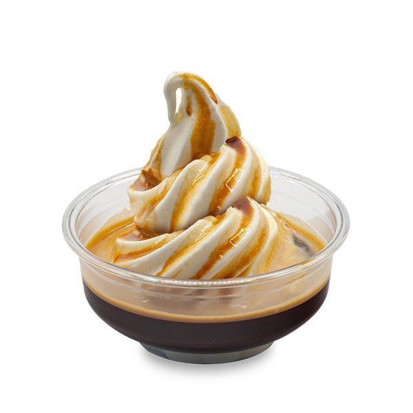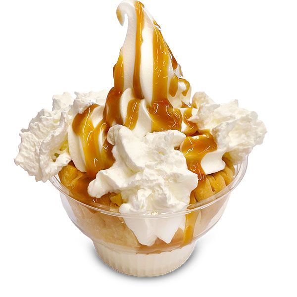 Soft serve ice cream, drizzled with hot buttery caramel sauce, accompanied by real whipped cream.