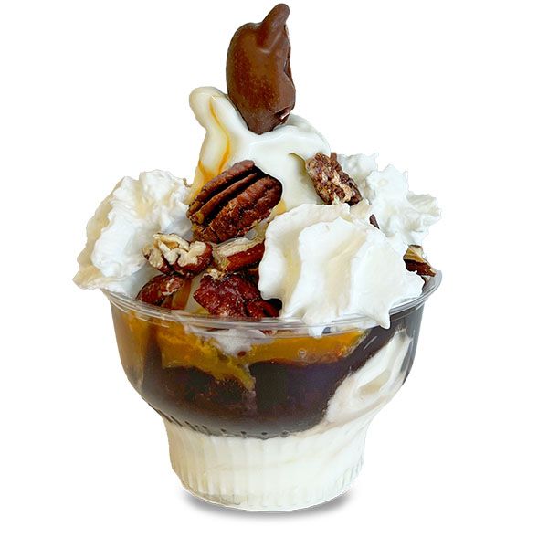 Hot Reese's peanut butter sauce, hot fudge sauce, Reese's minis, and whipped cream, surround our vanilla soft serve made with real cream.